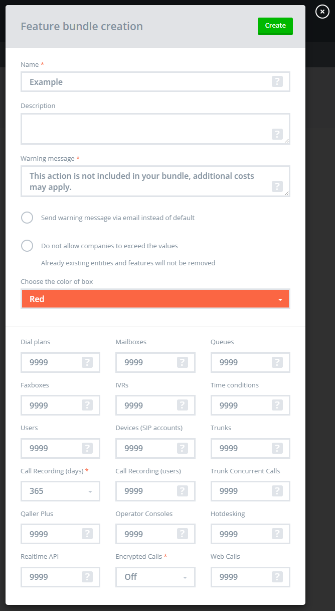 With Feature Bundle, you can control which functionalities are included in a customer’s subscription by setting limits for dial plans, users, devices, and more. If a customer adds a new functionality that isn’t included in their plan or exceeds the set limit, a warning message (yellow popup) will appear. Additionally, an email notification will be sent to the company’s billing contact.