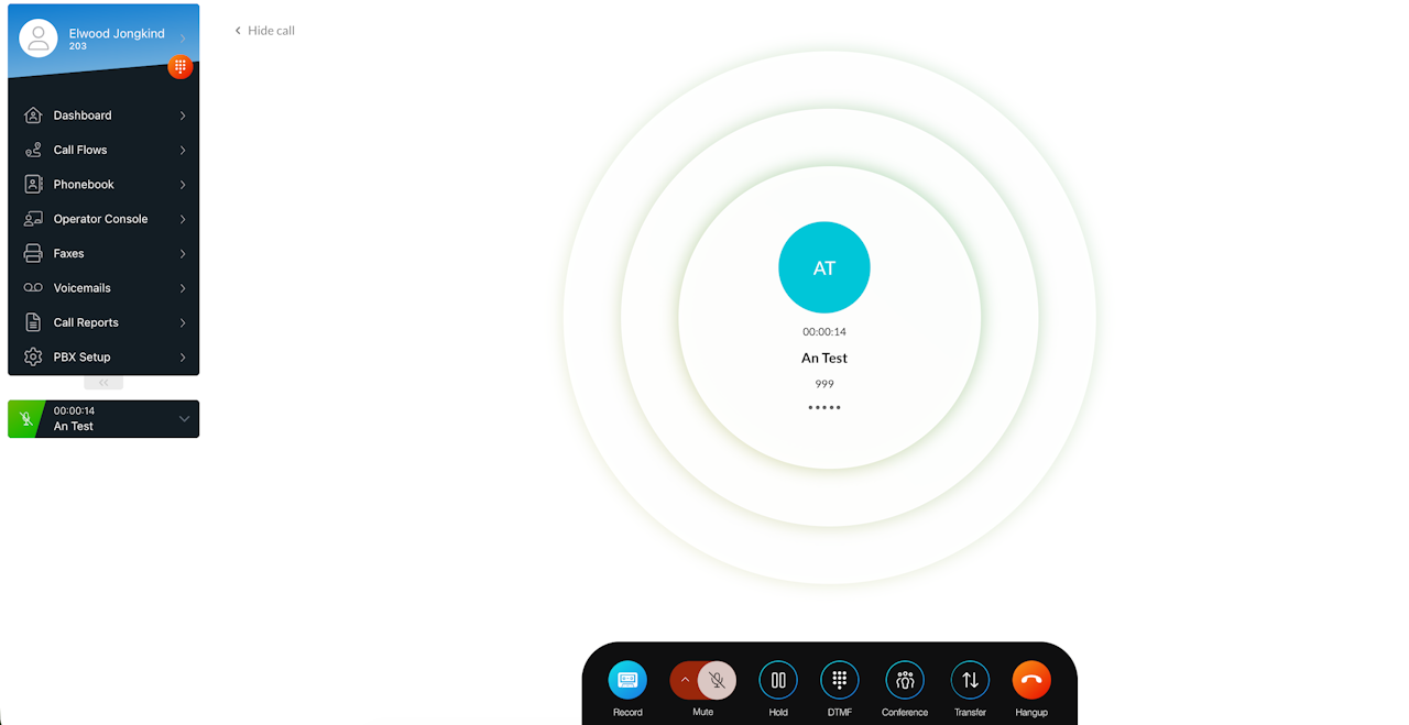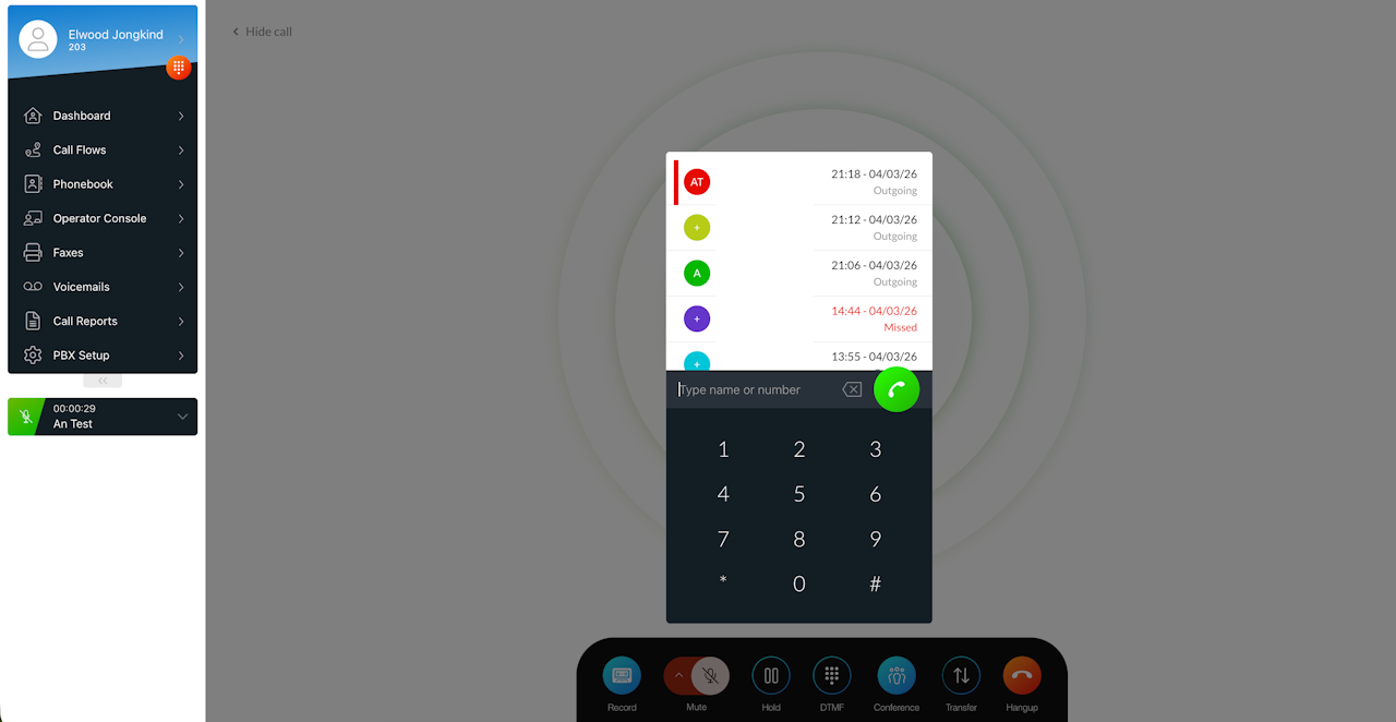 💡 The action bar contains the following buttons: Record, Mute, Hold, Keypad, Conference, Transfer, and Hang up.